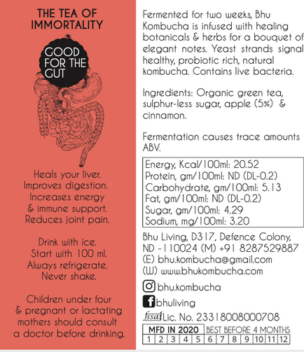 Process: Fermented for two weeks, Bhu Kombucha is infused with healing botanicals & herbs for a bouquet of elegant notes. Yeast strands signal healthy, probiotic-rich, natural kombucha.