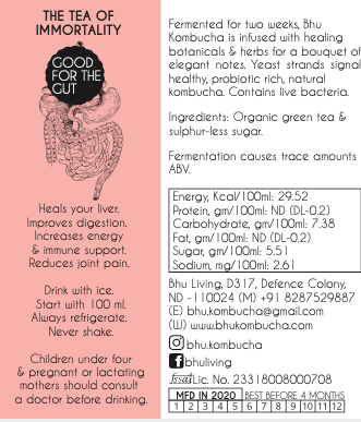 Process: Fermented for two weeks, Bhu Kombucha is infused with healing botanicals & herbs for a bouquet of elegant notes. Yeast strands signal healthy, probiotic-rich, natural kombucha.